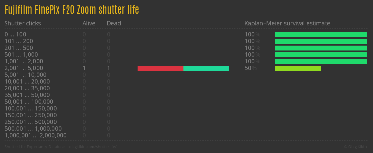 Direct link to this page: Fujifilm FinePix F20 ZoomAverage number of actuations after which shutter is still alive: 3,030.0